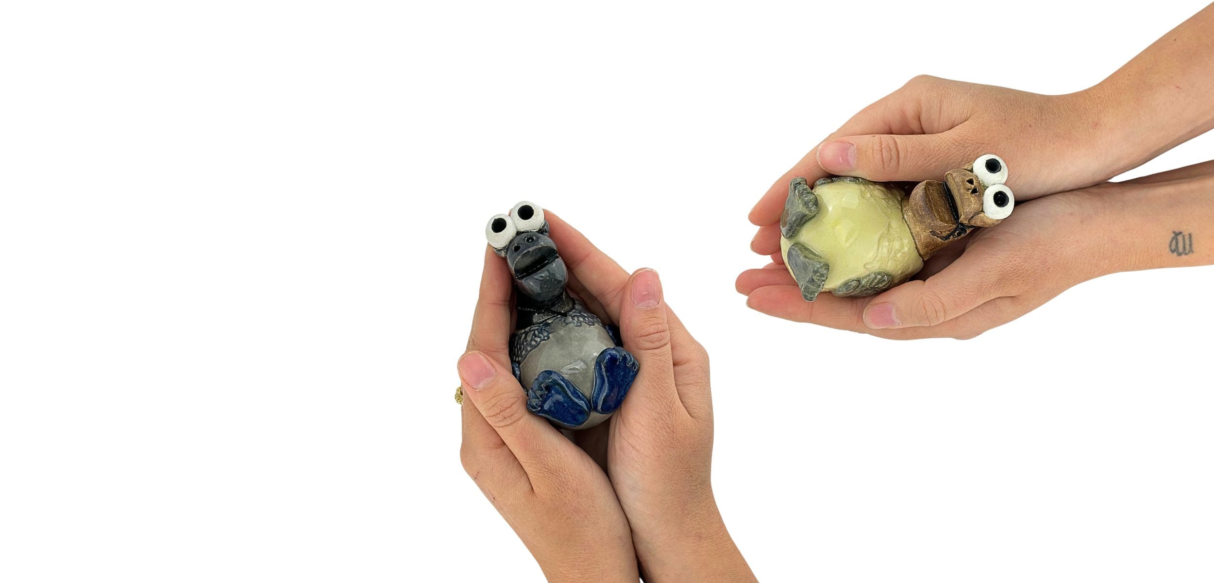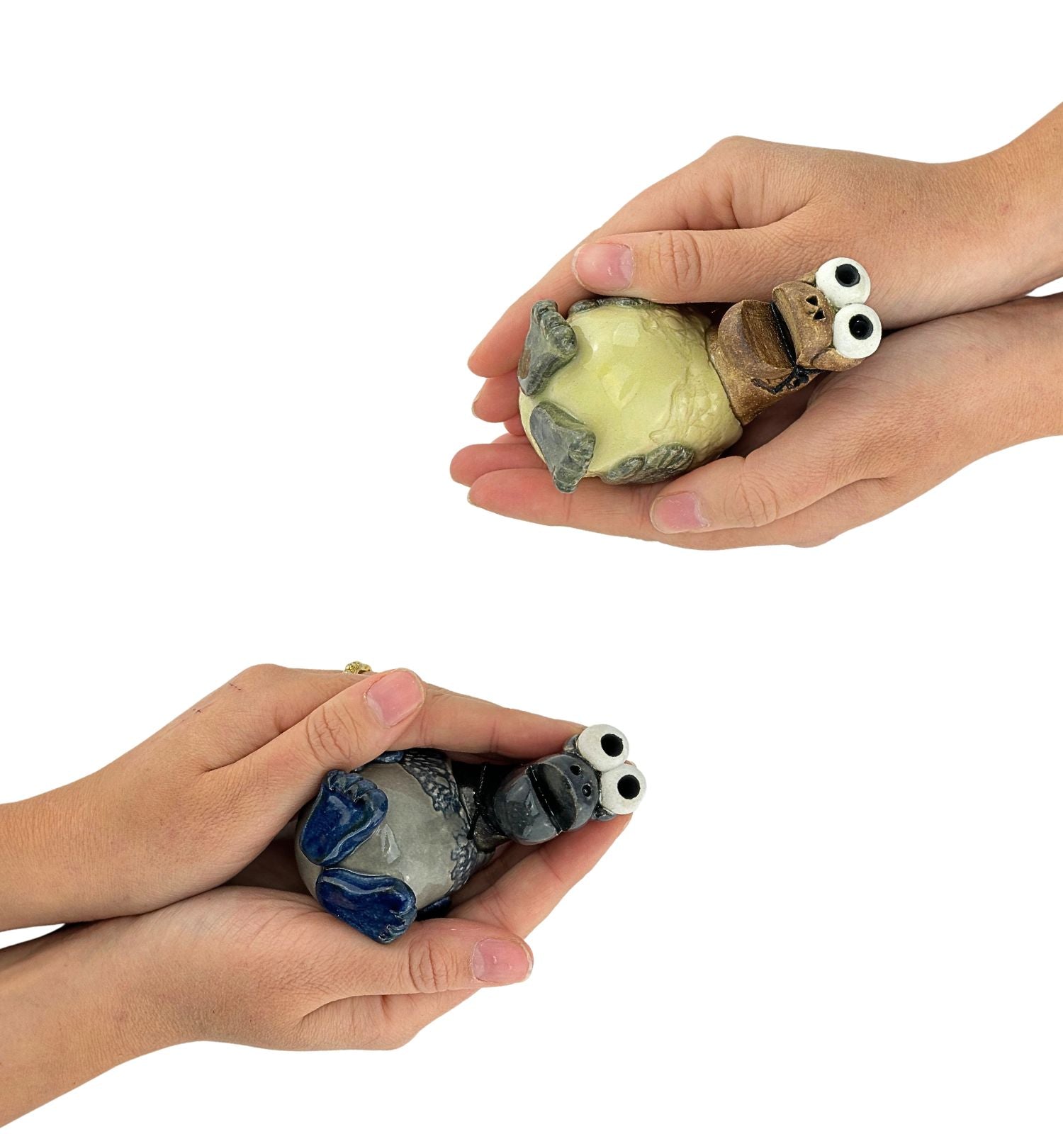 Alle Vibeke Hørlycks debatdyr er håndlavet unika. De er udformet i ler, brændt og glaseret / malet.